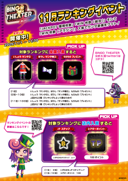『BINGO THEATER』11月ランキングイベント告知POP をご用意いたしました。店舗販促活動にご活用いただけますようお願い申し上げます。尚、使用時には以下の事項に注意ください。