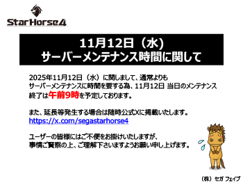 『StarHorse4』11月12日サーバーメンテナンス時間延長告知POP
