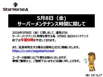 『StarHorse4』5月8日サーバーメンテナンス時間延長告知POP をご用意いたしました。店舗販促活動にご活用いただけますようお願い申し上げます。尚、使用時には以下の事項に注意ください。
